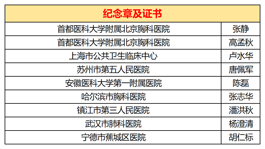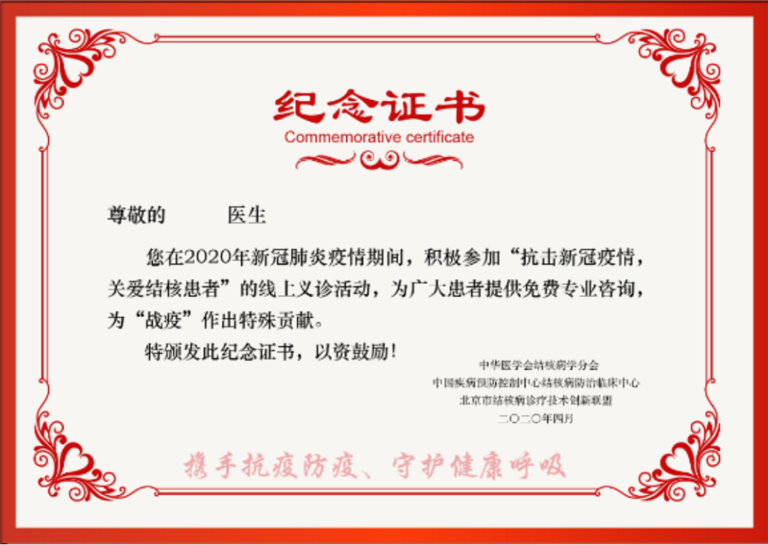为给开展线上义诊的医务人员留存一份值得纪念的荣誉,中华医学会结核病学分会、北京结核病诊疗技术创新联盟和中国疾病预防控制中心结核病防治临床中心联名为参加线上义诊的医务人员发放电子纪念证书、纪念签字笔和纪念章。